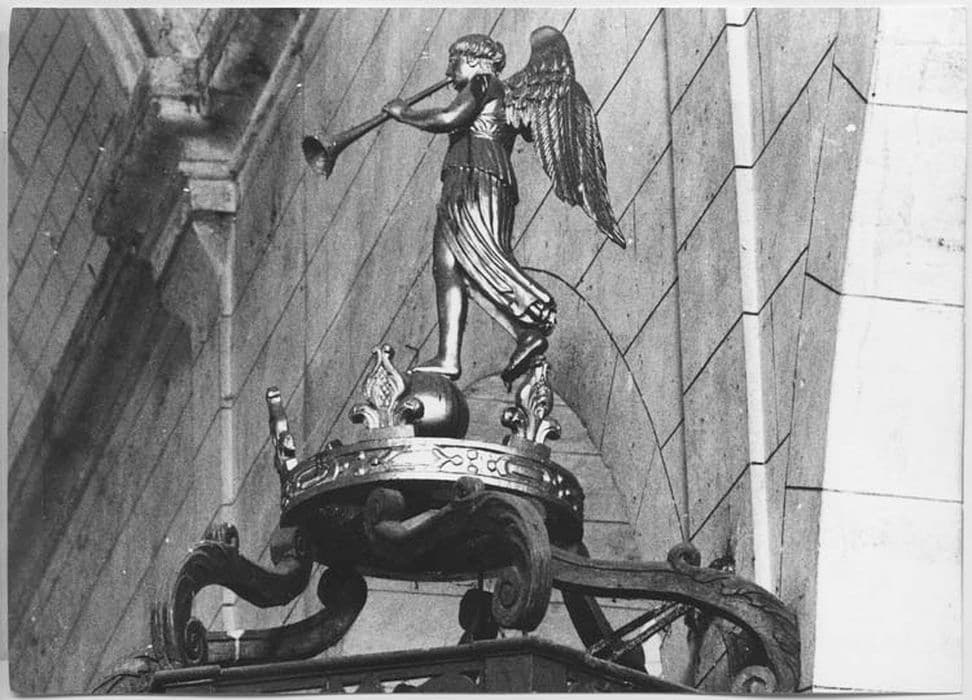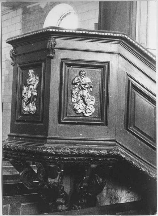 Chaire à prêcher avec abat-voix, la statue de l'ange à trompette et sa cuve avec les évangélistes et leurs symboles.