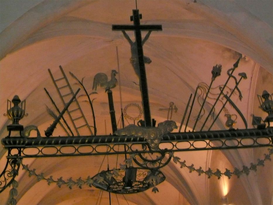 Arc triomphal orné des instruments de la Passion. Curieux porte-Christ.