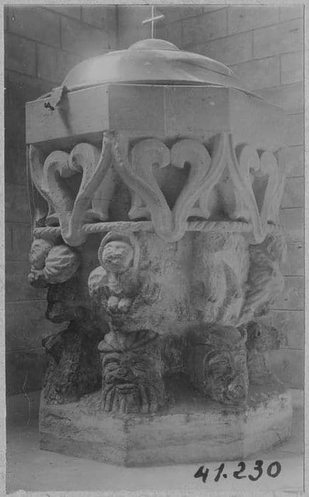 Cuve baptismale. Base polygonale : masques soutenant des grotesques ; au-dessus, frise architecturale.