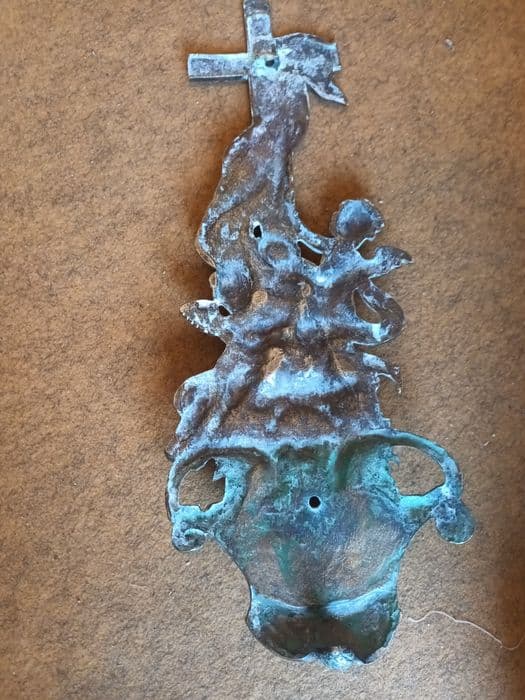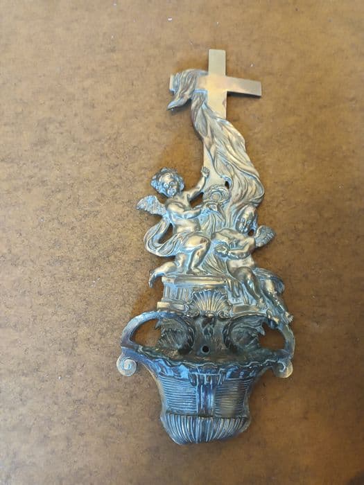 bénitier : Deux angelots tenant les instruments de la Passion au pied de la croix d'où pend une draperie