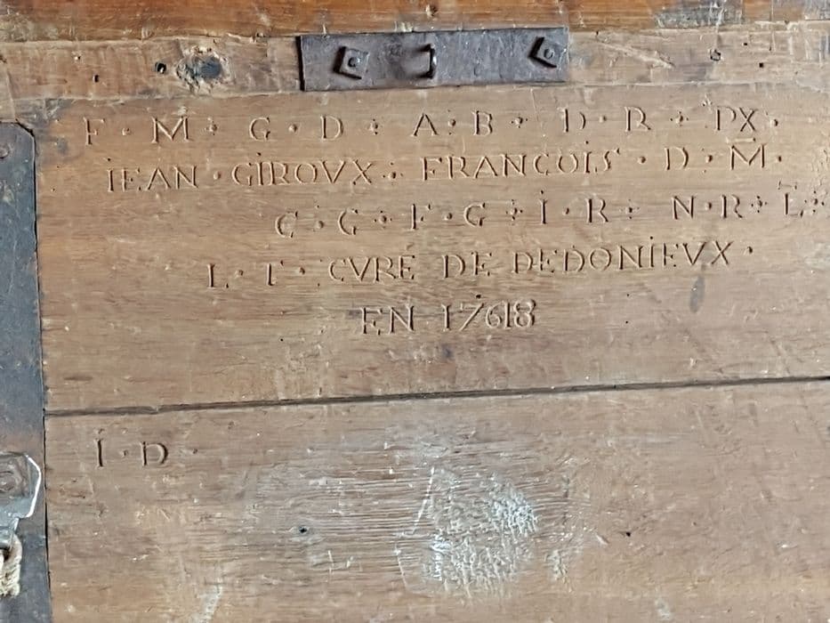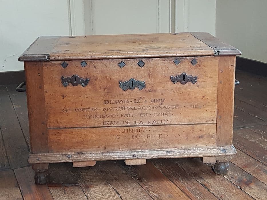 Coffre de communauté, ferrures. L'ensemble du coffre est intéressant par sa bonne conservation et surtout par toutes les inscriptions qu'il renferme.