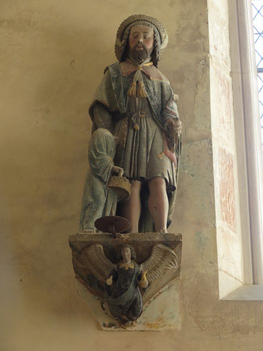 Statue, Saint Joseph charpentier et l'Enfant Jésus, et sa console : ange tenant des burettes, pierre polychrome, milieu du XVIème siècle.