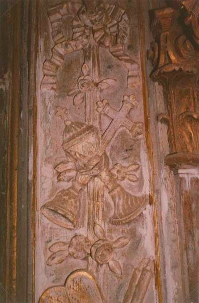 Sur le tombeau, un gradin supportant le tabernacle, est surmonté lui-même d'une exposition à quatre pieds contournés soutenant une gloire. L'exposition porte à feaux sur le tabernacle en raison de l'adjonction dans le cadre central d'un bas-relief en plâtre moderne. Derrière le tabernacle, une galerie de panneaux sculptés. Au-dessus d'elle, un cadre cintré du haut, cantonné de deux hauts panneaux. Cantonnant le cadre, deux colonnes en bois, à chapiteau composite, soutenant l'entablement cintré. De chaque côté du cadre, une niche à coquille surmontant un cul-de-lampe et dominée par trois pendentifs de feuillages. deux pilastres composites engagés terminent le retable. Le corps central du retable est seul surmonté d'un fronton.
