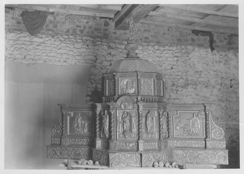 Tabernacle à plan semi-circulaire, taillé à cinq pans et appliqué au mur. Base décorée de rinceaux, une seconde base la surmonte. Au-dessus, sont cinq panneaux présentant une niche contenant des statuettes en haut-relief. Chacun de ces panneaux est flanqué de deux colonnes, une à chaque angle, surmontée d'une corniche portant un pot de fleurs. Les colonnettes torses sont surmontées de chapiteaux composites. La porte du tabernacle est surmontée d'un entablement rompu au milieu du cintre par deux volutes unies par une guirlande. Chacun des panneaux latéraux est surmonté d'une balustrade. Au-dessus, une seconde série de cinq panneaux moins haute, séparés par des colonnettes torses supportant une corniche. Le tabernacle est terminé par une coupole à cinq pans.Les deux étages du tabernacle se continuent selon le même mode d'arrangement dans le retable.