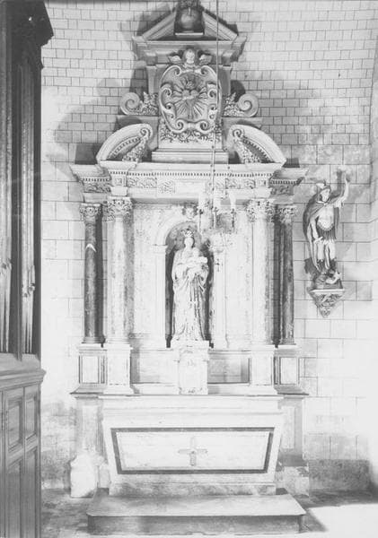 Retable en tuffeau composé de quatre colonnes de marbre encadrant une niche et supportant un entablement dominé par des frontons rompus et un corps carré surmonté d'un fronton triangulaire. Il est identique à celui du Sacré-Coeur.