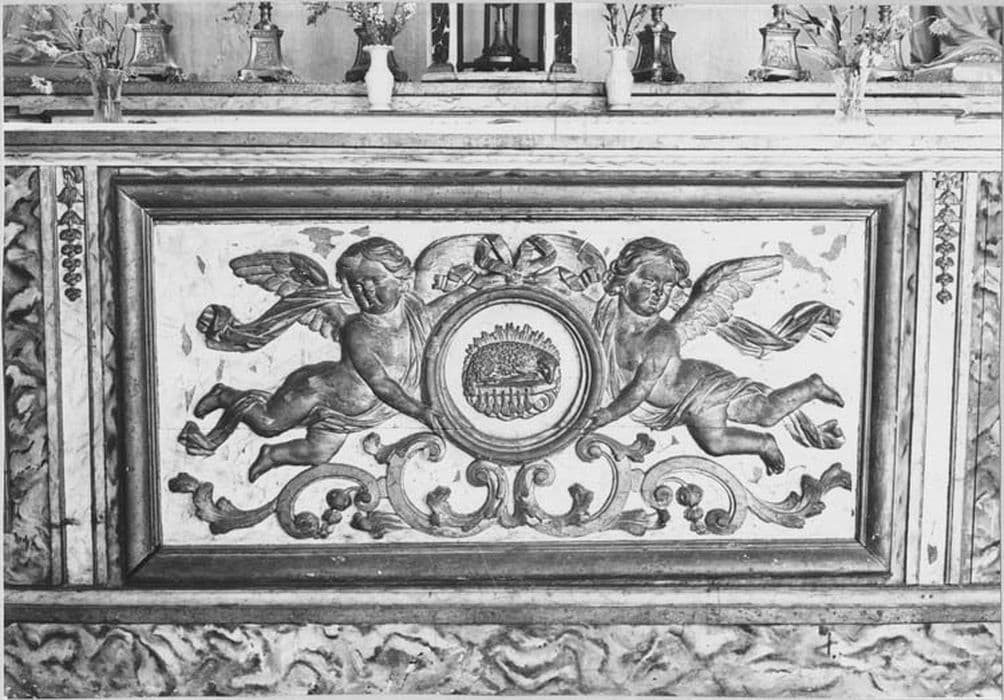 Bois repeint et redoré au bronze. Un panneau, ceinturé d'un forte moulure, offre en bas reliefdeux angelots voletant qui présentent un médaillon circulaire au centre duquel l'agneau symbolique est étendu sur le livre des sept sceaux. A la partie inférieure s'opposent des crossettes ornées de fleurettes et de longues feuilles.