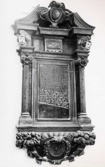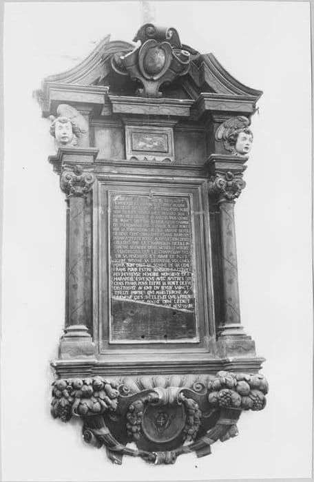 Epitaphe et son encadrement. Pierre repeinte. Deux colonnes ioniques supportent l'entablement avec son fronton brisé à volutes. Décor très opulent : double corne d'abondance du culot, encadrant un cartouche au centre duquel était sculptée, chose fréquente sur ce type de monument, une tête de mort (martelée, lui furent substituées vers 1840 les armoiries de l'évêque de Toul, Hugues des Hazards, né à Blénod, et constructeur de l'église, dont le nom est rappelé dans le texte de fondation que mentionne l'épitaphe) ; têtes d'angelots ailés de l'entablement.