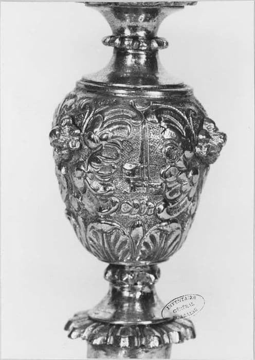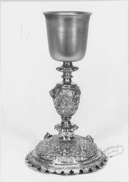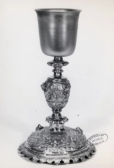 Argent redoré. Par son pied, sa tige au noeud si caractéristique, ce calice présente dispositions, volumes et décor des calices français tels qu'en la plupart d'entre eux à partir du milieu du 17e siècle. On y retrouve en effet, à la base du pied les feuilles d'acanthe ajourées entre elles, le dessus du pied fortement bombé, la tige avec ses tores inférieur et supérieur godronnés et son noeud piriforme. Le décor a toute l'opulence du baroque, notamment avec les têtes d'angelots aux ailes largement développées ; ici, elles sont en plein relief sur le dessus du pied, où elles séparent des trophées d'instruments de la Passion, et sur le noeud. La coupe, bien que ne portant pas de ponçon est très visiblement un apport des débuts du 19e siècle. On retiendra la maladresse de la facture, si évidente avec la ceinture d'acanthe du pied très sommairement modelée, les godrons, et plus encore les têtes d'angelots qui semblent le fruit d'un mauvais surmoulage, et dont aucune ciselure ne vient mettre l'accent sur les détails empâtés lors de la fonte. La tige est aujourd'hui assemblée au pied par une tige en fer à écrou moderne.