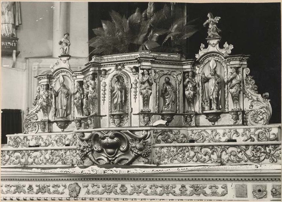 Bois repeint et redoré au bronze. Sur un autel dont le devant comporte de bons détails sculptés, mais réagencés sans goût et mêlés à des éléments adventices pour lui donner plus de longueur, est disposé au-dessus d'un gradin un large tabernacle développé latéralement par deux panneaux verticaux terminés par des ailerons. Sous la partie centrale du tabernacle, un opulent cartouche baroque chargé de deux cornes d'abondance, interrompt les horizontales des gradins. Des anges cariatides gainés accusent les angles du tabernacle et encadrent les panneaux latéraux. A la statuette du Christ tenant le globe du monde sur la porte, correspondent latéralement celles des apôtres Pierre et Paul sensiblement plus importantes, tandis que les statuettes des panneaux sont consacrées à saint Rémy, patron de l'église, et à saint Nicolas. Au-dessus de l'encadrement terminé par un plein cintre auquel chacune s'adosse, un piédouche porte une statuette d'ange adorateur dont la présence était accordée à l'exposition qui, jusqu'à ces dernières années, surmontait le tabernacle comme il est habituel. Toute la sculpture, figures et décor, d'une belle qualité d'exécution, utilise un répertoire de motifs en faveur à la fin du règne de Louis XIV, le cartouche soulignant le tabernacle rapellerait toutefois des formes antérieures.