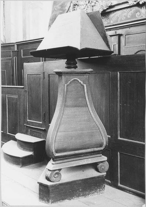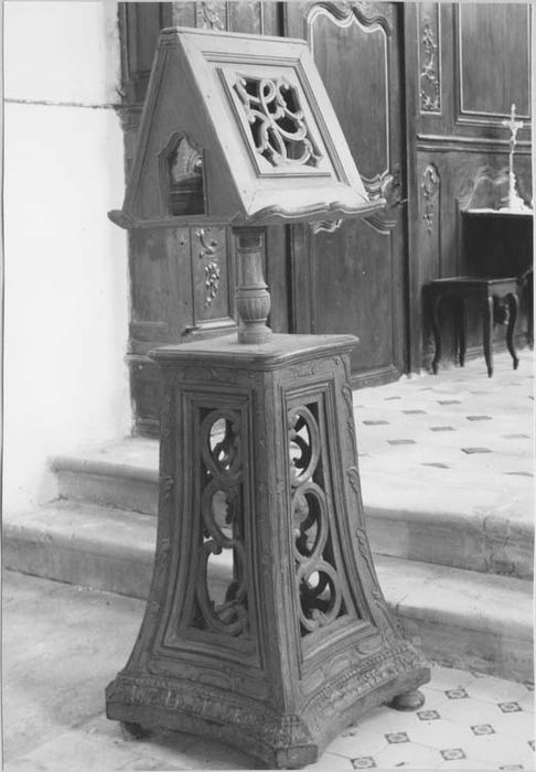 Bois repeint en faux-bois. Base en forme de piédouche à trois faces, dont le galbe puissant est accusé par une moulure chantournée à sa partie haute. Une autre moulure fermement profilée en souligne le pied que surélève à chacun de ses angles une forte volute. Le pupitre, monté sur un manchon tourné le coiffe de ses quatre pans comme une toiture.