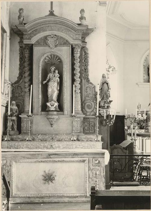 Bois sculpté et repeint. Autel de saint Joseph : il comprend l'autel proprement dit, en arrière duquel un double gradin porte un haut retable abritant la statue du titulaire. Sur la contretable, un panneau de planches grossières, avec en son centre une croix (apport médiocre du début 19e siècle), est encadré d'une large moulure sculptée, les planches tiennent vraissemblablement la place d'un tissu ou d'un panneau peint. De part et d'autre, un panneau vertical l'accompagne où, sous une tête ailée d'angelot, un long cordon double aux multiples noeuds retient une chute d'outils de menuisier, évocation de la profession de saint Joseph. Des rinceaux et des volutes courent sur la frise constituant la face des deux gradins. Du retable on observera l'inhabituel d'une composition qui tend à la dégager de la paroi, la position avancée du corps central où se creuse la niche lui confère une densité que n'atteignent pas la plupart des autels secondaires de la région Lorraine, réduits le plus souvent à n'être, pour leur retable, qu'un placage plus ou moins orné. Sur un soubassement, la haute niche dans laquelle est exposée la statue de saint Joseph s'ouvre dans un avant-corps accompagné de deux colonnes à chapiteaux corinthiens. Droites jusqu'aux deux cinquièmes de leur élévation, torses ensuite, elles supportent un entablement, cintré au-dessus de la niche, que surmontent deux pots à feu et, au centre, une croix. Un aileron plaqué au mur flanque chaque colonne. Sur le panneau central du soubassement, deux têtes ailées d'angelots s'inscrivent dans la courbe de deux longues feuilles opposées limitant une sorte de console prolongeant le sol de la niche. Une même tête d'angelot, des fleurons et des volutes ornent les dés des colonnes, tandis que sous les ailerons ne subsiste que le panneau de gauche couvert d'entrelacs et de volutes. C'est encore une moulure agrémentée de sculpture qui cerne la niche dont le cul-de-four est constitué par une coquille ; des palmes retombent au-dessus de son cintre. Sur la partie droite des colonnes, on retrouve encore les volutes autour d'un médaillon en façon de cuir découpé, sur la partie torse s'enroule une tige aux rameaux feuillus. Un décor de volutes se répète sur la frise de l'entablement. De longues et souples feuilles montent de la partie inférieure des ailerons dont le milieu est quadrillé en losange. Une chute de fleurs et de feuilles retombe de leur sommet. Un socle uni reçoit la statue de saint Joseph figuré debout, portant l'Enfant Jésus assis sur sa main gauche. La main gauche tenait sans doute l'habituelle tige de lys. L'autel de la Vierge : de composition identique à celui de saint Joseph, avec seuls quelques éléments qui diffèrent. Le panneau de la contretable peint en faux-marbre est orné du monogramme AM aux lettres enlacées sur fond de rayons ; ce motif moulé en pâte n'est pas antérieur au début du 19e siècle. Sur les deux étroits panneaux verticaux des extrémités, une coquille surmonte une chute de fleurs. Le panneau central du soubassement du retable est nu, mais s'en dégage un opulent culot sculpté de feuilles d'acanthe, de fleurons et de volutes, prolongeant le sol de la niche. Les colonnes (ici à chapiteaux composites) offrent des spires plus nombreuses. Un décor beaucoup plus dense de tiges de feuillages sur la partie droite, de pampres chargés de grappes sur la partie torse les recouvre. Au-dessus de la niche, un cartouche baroque renferme le monogramme du nom de Jésus IHS, sous le H sont disposés trois longs clous, un dessus une croix. La présence de ce monogramme semblerait signifier que l'autel fut tout d'abord voué au Christ. Le dessin de la partie inférieure des ailerons est d'une élégance moindre que sur l'autel de saint Joseph. Un socle uni reçoit la statue de la Vierge représentée debout, portant l'Enfant assis sur la main gauche.