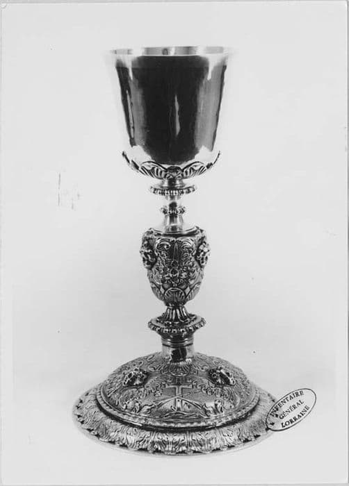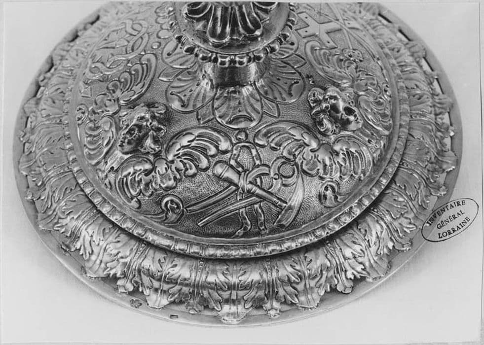 Le pied circulaire comporte à sa partie inférieure un rang de feuilles d'acanthe ajourées entre elles ; son dessus, bombé, est orné entre trois têtes d'angelots ailées en relief d'attributs de la Passion. Il s'élève jusqu'à une moulure godronnée soulignant le départ de la tige coupée d'un fort noeud piriforme également paré des mêmes têtes d'angelots. La coupe est soulignée par un embryon de fausse coupe faite de larges feuilles d'acanthe.