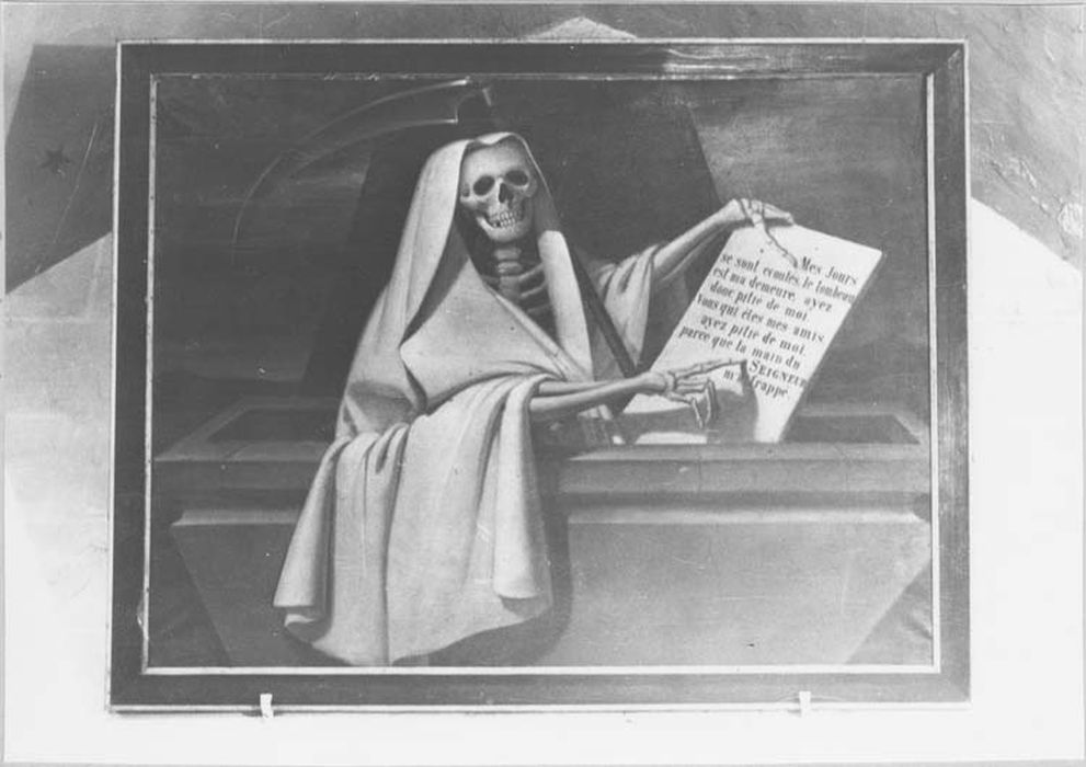 Inscription : Mes jours se sont écoulés, le tombeau est ma demeure, ayez donc pitié de moi. vous qui êtes mes amis ayez pitié de moi, parce que la main du Seigneur m'a frappé.