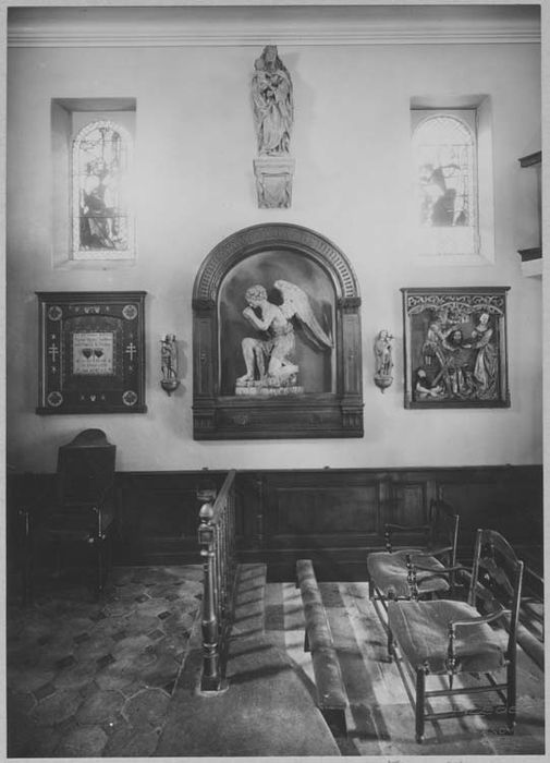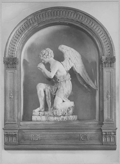 Sculpture de l'école de Ligier ; provient de Saint-Mihiel ; a probablement été soustrait à l'autodafé de 1793, au cours duquel le second ange, dont les ailes subsistent seules, semble avoir péri. Encadrement de niche en bois sculpté, exécuté en 1931 sur documents du début de la Renaissance.