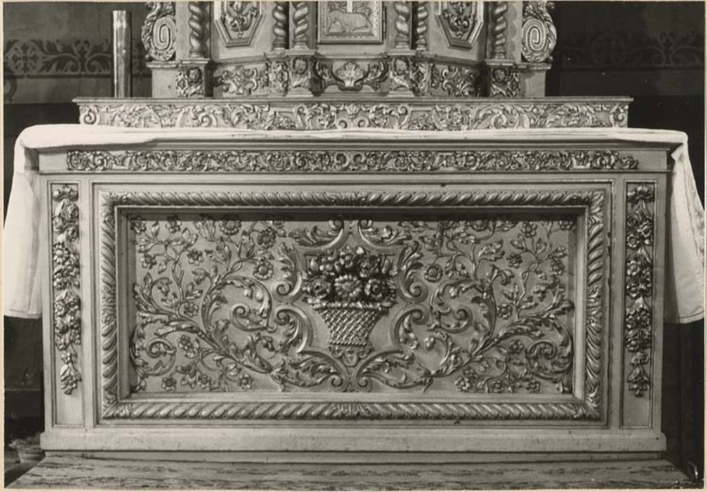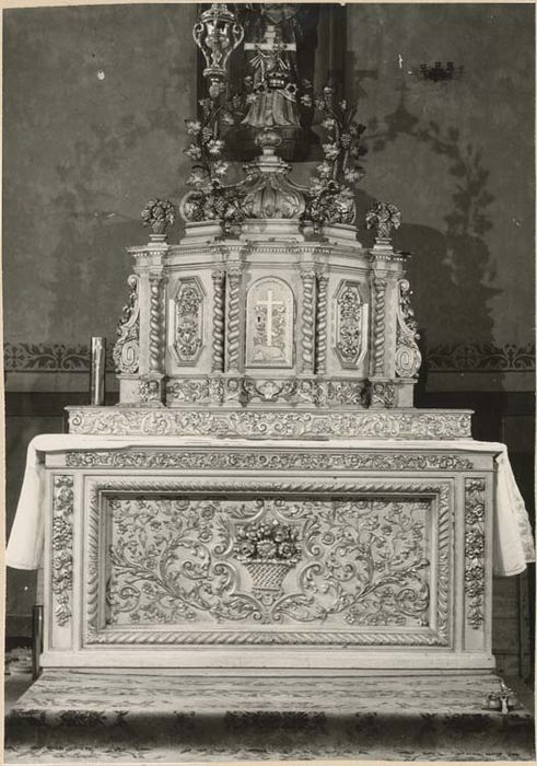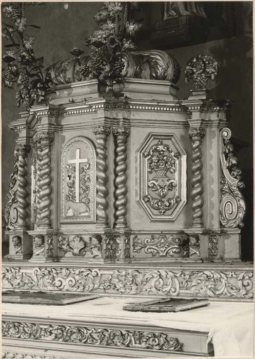 Bois repeint et redoré. Il se compose de l'autel proprement dit, supportant par l'intermédiaire d'un gradin, un tabernacle monumental. La contretable est formée d'un panneau, encadré d'une moulure godronnée, d'où se détache, au centre, en bas-relief, sur un fond de rinceaux, un panier de fleurs. De part et d'autre, une chute de fleurs, au-dessus, un bandeau également couvert de rinceaux, l'accompagnent. Le décor du gradin est, de même, formé de rinceaux. Un ordre corinthien miniature, reposant sur un piédestal, et supportant un entablement, établit la structure du tabernacle dont la face, les côtés disposés en pans coupés, sont respectivement encadrés par deux colonnes torses. Sur la porte, autour d'une croix dominant l'agneau, montent des pampres tandis que, sur chacun des côtés, une forte moulure cerne une composition faite de volutes et d'un panier de fleurs. Des têtes d'angelots ailées, des motifs variés, occupent toutes les surfaces du piédestal. Des ailerons fixent les extrémités de l'ensemble. Au-dessus de l'entablement, quatre volutes partant chacune de l'un des angles, se réunissent au centre sous une petite sphère supportant un Christ en croix ; elles constituent un couronnement peu élevé, entre deux petits paniers de fleurs.