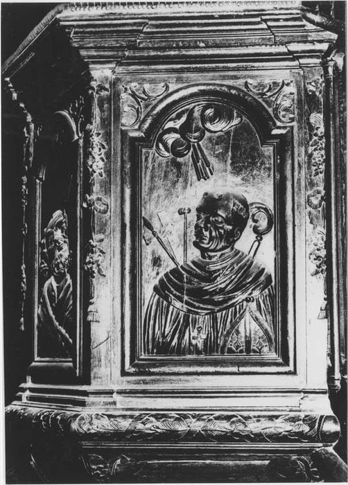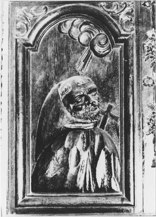 L'iconographie des panneaux, avec un saint Franciscain et deux abbés Bénédictins ou d'un ordre observant cette règle, rend douteuse pour cette chaire, sa provenance d'un établissement religieux, l'effigie de saint Pierre semble, d'autre part, signifier qu'elle aurait été exécutée pour une église placée sous son titre.