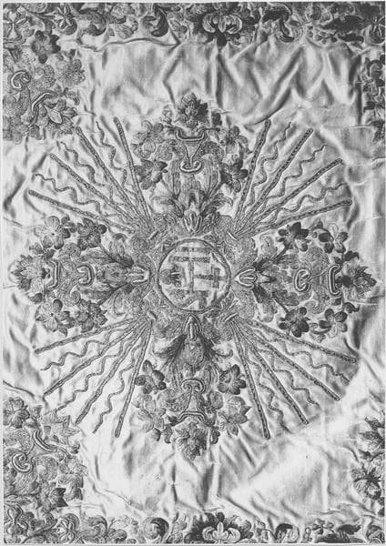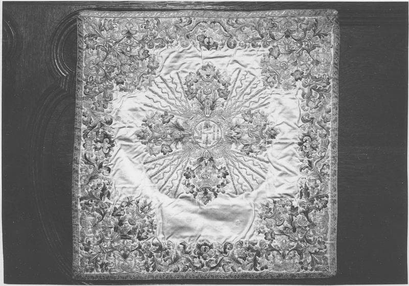 matériau textile : satin (blanc), brodé ; fil métal : doré ; soie : polychrome