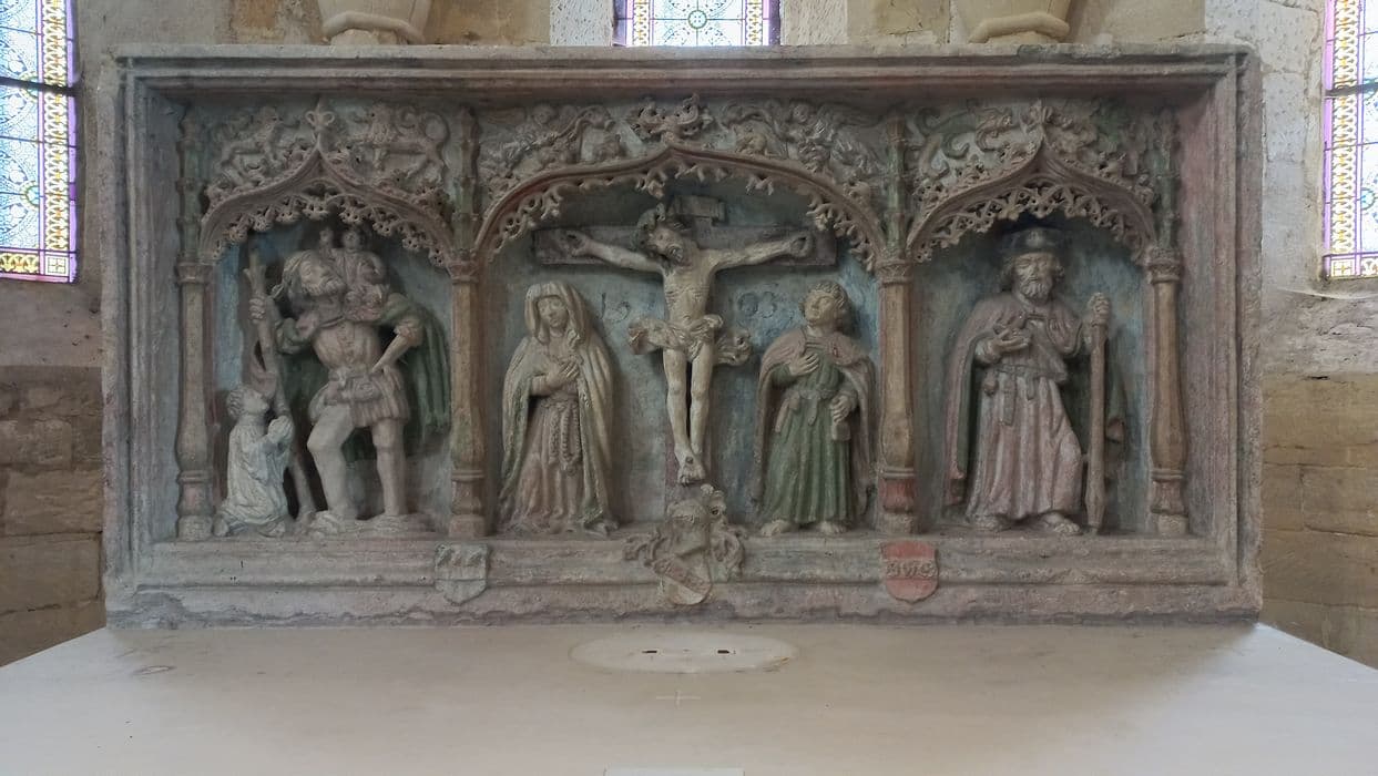 Retable : la Crucifixion, saint Christophe et saint Jacques. Dans un cadre mouluré, trois arcatures polylobées reposant sur des colonnettes à pans dont la partie basse est renflée abritent : saint Christophe au pied duquel figure agenouillé le donateur, un clerc ; sous celle du milieu, le Christ en croix accompagné de la Vierge et de saint Jean ; sous celle de droite, saint Jacques en habit de pélerin. Statues traitées en ronde bosse. Dans les écoinçons des arcatures, lions, anges thuriféraires et dauphins.