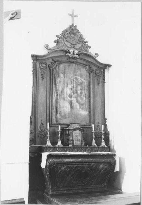 Bois repeint. En forme de tombeau, l'autel supporte un gradin sur lequel est disposé le tabernacle. En arrière, le retable est composé d'un peinture sur toile, présentée dans une boiserie couronnée d'une corniche cintrée à courbe et contre-courbe, surmontée par un cartouche rocaille constituant un fronton. Un jeu de moulures délimite, sur le devant de l'autel, un panneau dont le centre est rempli par un large motif d'un beau dessin rocaille, les angles du tombeau sont atténués par d'autres motifs de même style. Le tabernacle, aux formes souples présente une face convexe, entre deux ailerons, et des flancs concaves sous une corniche cintrée ; sur la porte, l'agneau symbolique est sculpté en faible relief. A la partie postérieure deux autres ailerons montrent qu'il dut y avoir là un autre gradin. Il est évident que le gradin nu existant est d'un travail récent, et que le tabernacle est un apport qui n'est pas à sa place sur un autel secondaire. Toutes les sculptures de l'ensemble sont de très belle qualité et relèvent de l'art de la rocaille. Il semble que les têtes d'angelots ailées, au centre de la corniche du retable, soient dues à une réfection. Si le tombeau est peint en faux-marbre vert foncé et brun rouge, le tabernacle et le retable sont traités en faux-bois.