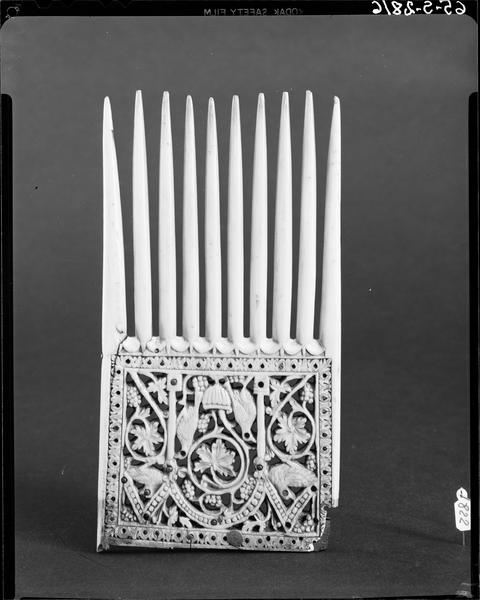 Peigne à dents opposées et dont il ne reste qu'un côté armé de dix grosses dents. Il ne reste plus que la dent latérale de côté opposé. L'intervalle est repercé à jour d'un arc plein cintre entre deux arcs angulaires, portés sur deux colonnettes. Sous l'arc central, un calice d'où sort un ceps où perche un oiseau. Bordures de feuilles formant palmettes. Perles d'émail dans les yeux des oiseaux, dans quelques parties de l'architecture, et dans l'oeil qui sépare les palmettes de la bordure.