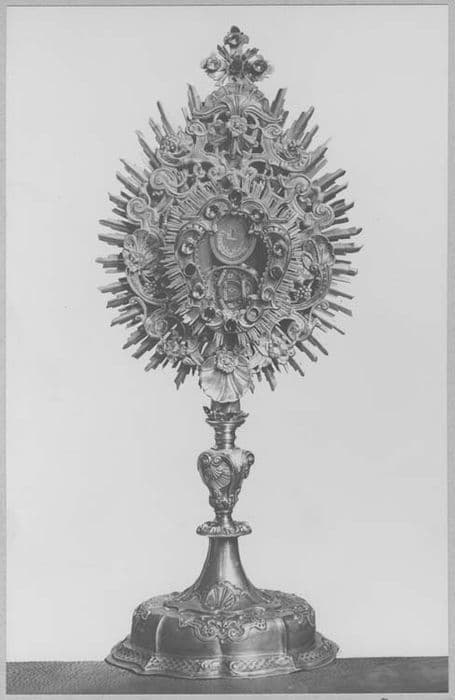 En forme d'ostensoir rayonnant. Au centre, sont des reliques entourées de pierreries fausses.