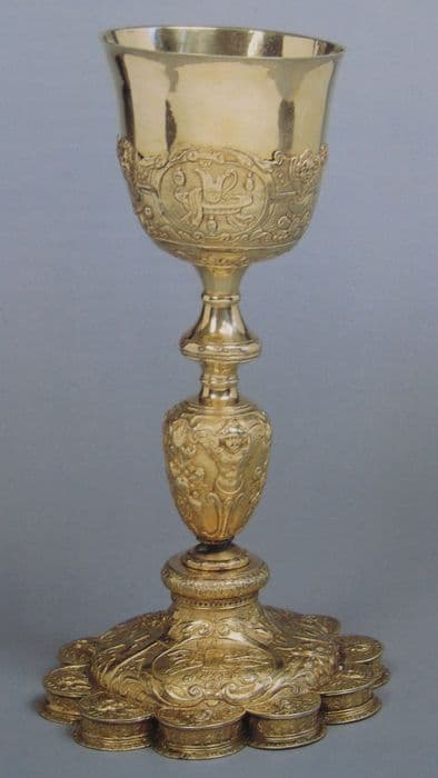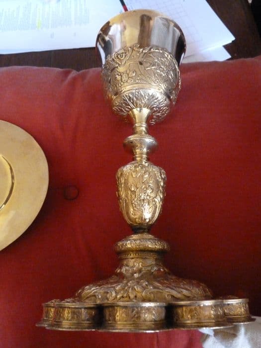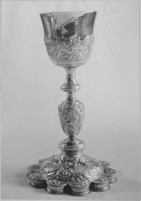 Pied polylobé. Sur le pied et sur la coupe, trophées constitués par des instruments de la Passion.