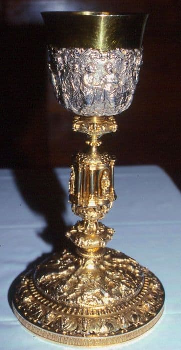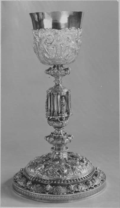 Noeud à colonnettes. Sur la coupe : Annonciation, Visitation, Présentation au Temple. Entre les colonnettes : sainte Anne, la Vierge, le Sauveur. Sur le pied : Mariage de la Vierge, Naissance de N.-S., Adoration des Mages. Une patène qui est jointe à ce calice et semble ancienne porte au revers la Cène.