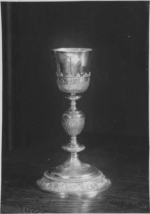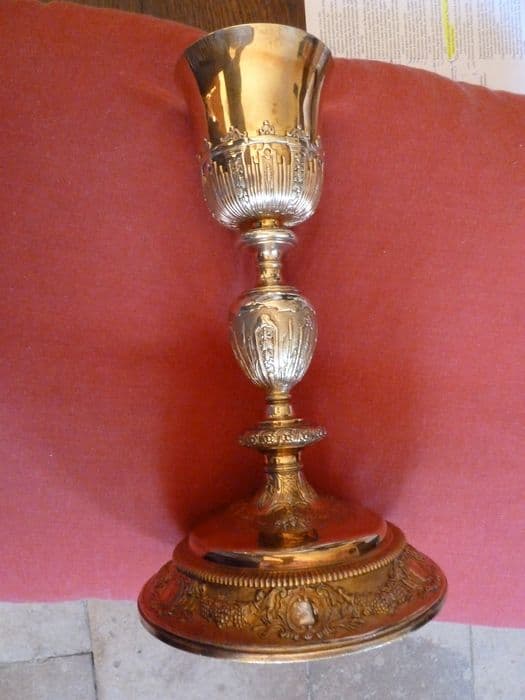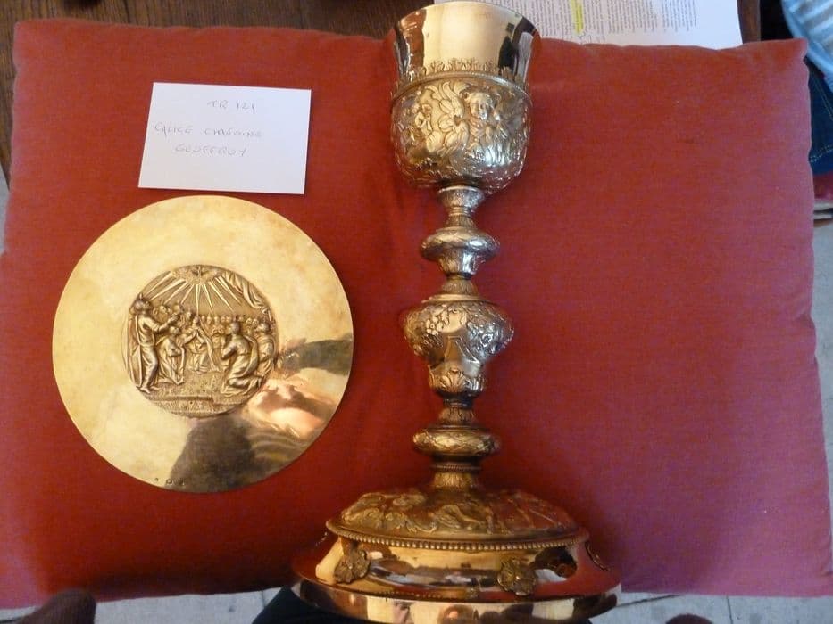 1er calice : anges tenant les instruments de la Passion (sous la coupe) ; Ecce Homo, Flagellation, Portement de croix (pied) ; noeud réparé et très mal redoré.