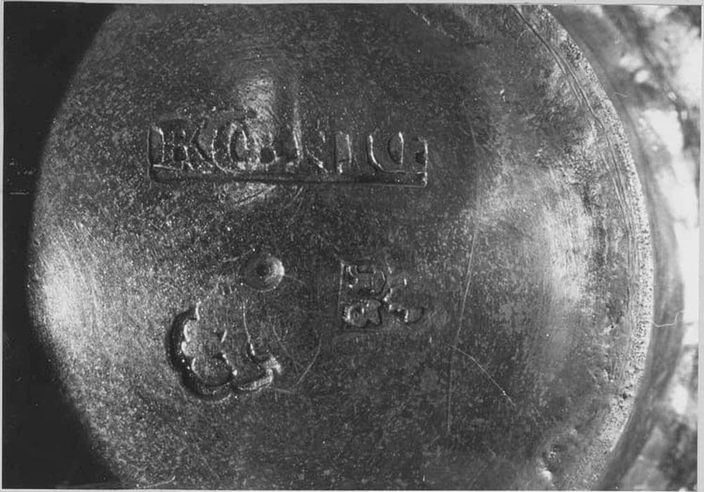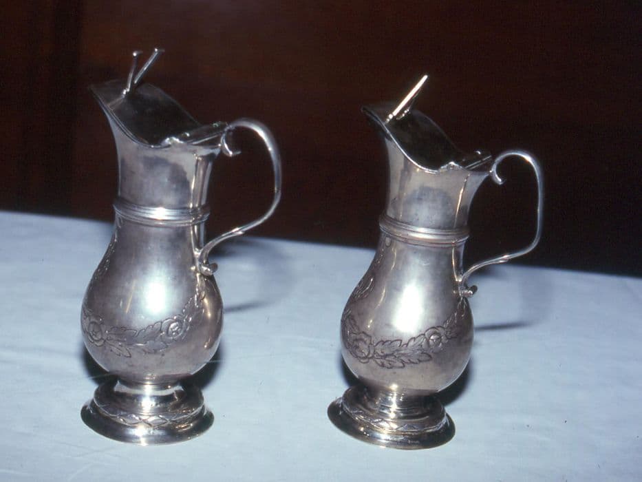 Intérieur doré. Leur pied circulaire conduit par une gorge à un corps en forme de balustre. Il est arrêté par une bague moulurée marquant le départ de la partie profilée pour former le bec verseur que modèle une arête en sa partie médiane. L'orifice se ferme par un couvercle à charnière qui en épouse le profil. L'anse est constituée par une volute se refermant à ses extrémités et fixée d'une part sur le corps balustre, d'autre part à la partie postérieure du bec verseur. Des guirlandes de fleurs gravées et entrecroisées sont le seul ornement du corps.
