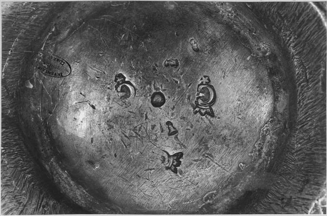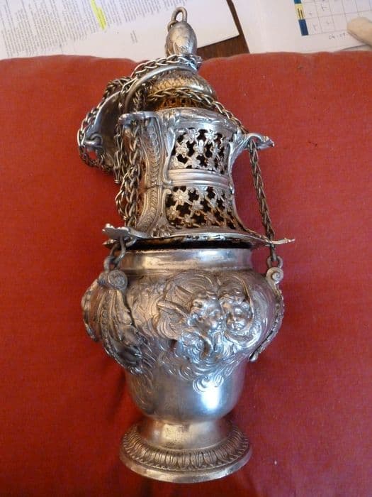 Une base circulaire ornée d'une ceinture de feuilles d'eau disposées en dents de scie supporte la cassolette en forme de balustre court, ses flancs sont divisés en trois parties par des excroissances faites de feuilles d'acanthe en fort relief d'où partent les chaînes ; entre-elles, des têtes d'angelots ailées s'enlèvent sur des fonds de nuages. Le couvercle se compose d'une partie concave assez élevée, ajourée par un réseau constitué de quatre feuilles, coupée horizontalement par une moulure ; elle est divisée en hauteur par trois éléments composites aux travers desquels courent les chaînes. Le couvercel a pour couronnement, au-dessus d'un tore orné, une partie ajourée également concave sous une sorte de calotte modelée de feuilles d'eau à son sommet ; d'un bouton orné part la chaîne servant à le lever. Les chaînes, du type dit à grain de blé, sont réunies à leur extrémité à une sorte de rosace servant à retenir l'encensoir dans la main ; cette rosace en cuivre, semble être le fruit d'une restauration.