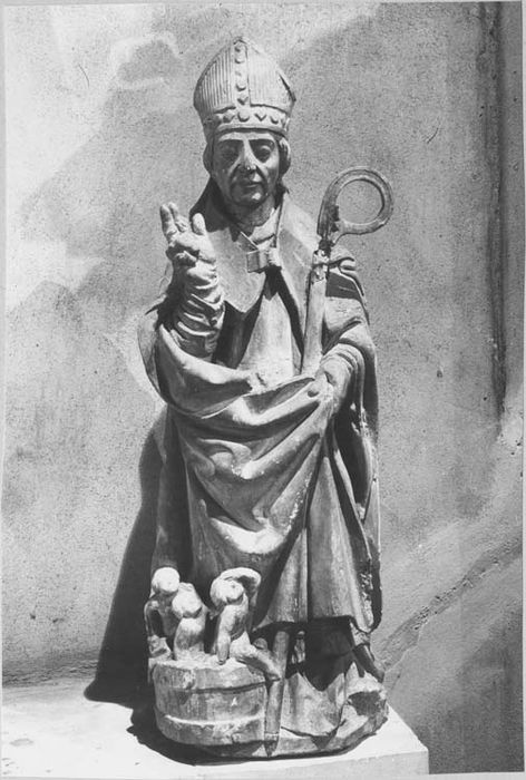 Pierre peinte en gris. Aux pieds du saint, les trois enfants. La crosse appuyée à la saingnée du bras gauche est privée de sa volute primitive que l'on a maladroitement tenté de remplacer.