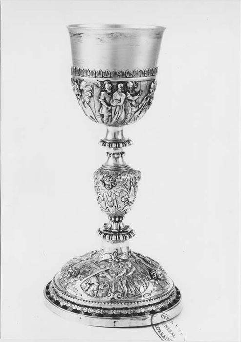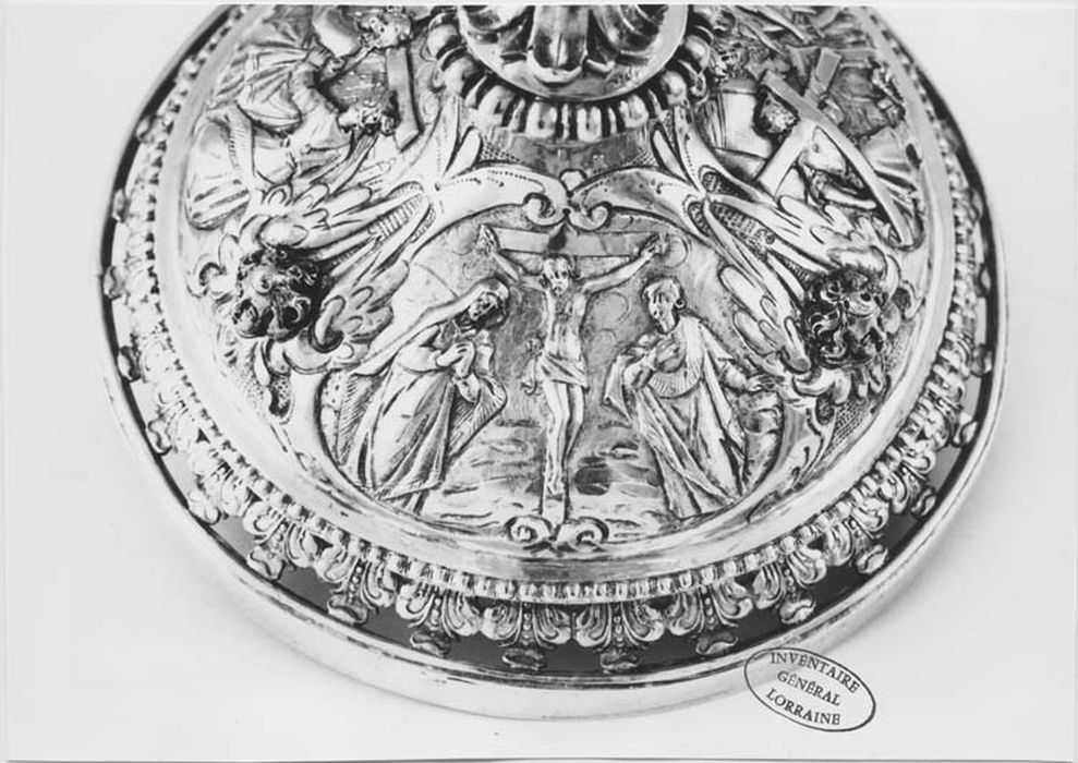 Partie inférieure du pied faite d'un cercle de feuilles d'acanthe ajourées entre elles, tandis que le dessus en est fortement bombé, les différentes parties de la tige avec le noeud animé de têtes d'angelots en relief, la fausse coupe bordée d'un feston de petites feuilles dressées, l'ample coupe enfin au rebord peu évasé. La plinthe qui surélève la base a vraissemblablement été surajoutée tardivement. Il est historié de scènes exécutées au repoussé et finement ciselées. Sur le dessus du pied, on voit la Condamnation de Jésus, la Montée au Calvaire, le Calvaire ; des têtes d'angelots en plein relief avec de longues ailes dressées les séparent. La fausse coupe expose Jésus devant Pilate, puis présenté au peuple (Ecce Homo), entre deux têtes d'angelots aux ailes étalées surmontant des motifs appartenant à la grammaire décorative baroque.
