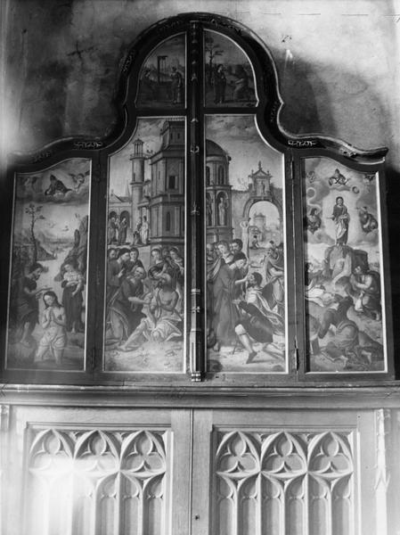 Protégé en 1908 comme armoire, tableaux (4), cadres (4) : Baptême du Christ (Le), Résurrection de Lazare (La), Guérison des aveugles à la piscine (La), Transfiguration (La). Note du CAOA du 30 décembre 1936 : Il y aurait lieu de remplacer la désignation sous laquelle ce meuble figure dans la liste des MH : armoire, bois sculpté et panneaux peints, XVIe et XVIIe s. par celle-ci : Retable, bois sculpté et doré, avec volets peints, les peintures des volets et les sculptures représentent des scènes de la vie du Christ, XVIe siècle.