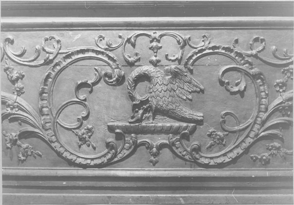 Bois repeint. Il se limite à un encadrement mouluré cernant un panneau couvert d'une élégante composition, dont le pélican symbolique, sur un bandeau godronné, est le centre. Deux importantes volutes rocailles où se mêlent des palmes, de longues et minces feuilles, des fleurettes, l'accompagnent.
