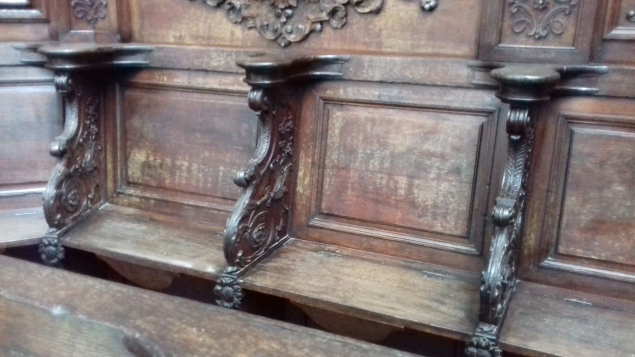 Boiseries et stalles. Ces objets composés de sept grands panneaux ornés de pilastres composites et de deux rangs de stalles constituent un ensemble complet qui paraît bien avoir été conçu pour l'emplacement qu'il occupe actuellement.