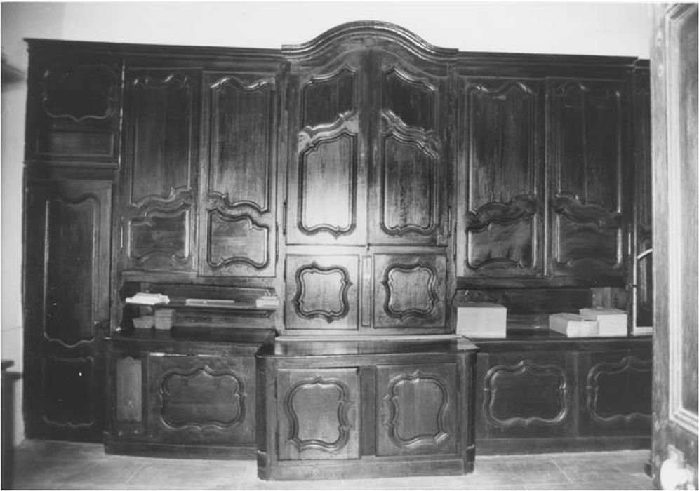 L'ensemble comprend un avant-corps central cintré à son sommet, avec corps du bas formant chasublier en très forte saillie ; deux parties latérales de longueurs inégales avec un vide entre les corps du bas et du haut ; à gauche, une porte d'accès aux sacristies, surmontées d'une imposte pleine ; enfin, à droite, à l'extrémité du corps supérieur, une haute et étroite porte. Toute cette façade est le résultat d'au moins un réaménagement dont témoigne très visiblement le corps inférieur de la partie centrale (chasublier), de même que la partie supérieure de la corniche. Hormis la porte d'accès, tous les panneaux s'ouvrent sur des placards par des portes simples ou doubles. La mouluration, vigoureuse par son profil et son dessin se réfère au style Louis XV. Tout le chêne mis en oeuvre a acquis une belle et chaude patine. Les ferrures sont de fer noirci.