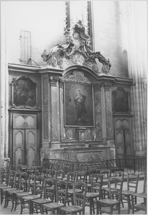 Autel, retable, portes de la sacristie, marbre (gris et rouge veinés), pierre (blanche peinte et dorée) et bois sculpté et peint (en gris). L'autel s'appuie à un ensemble revêtant toute la partie inférieure de la paroi est du bras sud du transept, et comportant un vaste retable à fronton baroque flanqué de deux hautes portes à deux vantaux, surmontées chacune d'une peinture enchassée dans la boiserie. Cet autel est un parallélépipède de marbre animé sur la face et sur les côtés par une forte moulure dessinant des panneaux aux montants chantournés. Il est prolongé latéralement par un soubassement portant, après deux étroits panneaux verticaux concaves et disposés obliquement pour faire saillir le retable sur la paroi, deux pilastres à chapiteaux composites redoublés par deux autres, disposés également sur plan oblique, qui encadrent un tableau surmontant un panneau à bordure rocaille coupé en son centre par un tabernacle adventice. Ce tableau visiblement non fait pour cet emplacement, d'une facture très médiocre, représente l'Immaculée Conception. Il est encadré d'un sèche moulure, mais surmonté d'un opulent fronton découpé, où de grandes lettres entrelacées mêlées de palmes dessinent le monogramme AM. L'entablement comporte une corniche cintrée en son centre sans architrave, ni bandeau. Un somptueux baldaquin baroque couronne l'ensemble. Ses grasses volutes à courbes et contre-courbes opposées, où s'accrochent palmes et guirlandes, supportent l'élément animé du sommet, le tympan qu'elles délimitent est couvert d'une masse de nuages rayonnants. En arrière du départ des volutes, deux vases baroques correspondent aux panneaux verticaux concaves déjà décrits. L'autel et son retable sont précédés d'un emmarchement de pierre sur plan galbé, entouré d'une grille basse à décor d'arcs brisés ; devant l'autel s'étend une marche de bois. Les éléments de boiseries latérales sont visiblement une adjonction postérieure, leur corniche de bois poursuit le profil de celle du retable qui, elle, est en pierre. Leurs portes doubles dissimulent à gauche, la porte gothique aux curieuses ferrures de l'escalier conduisant aux combles, à droite un placard. Les vantaux sont constitués de panneaux chantournés surmontés d'une imposte fixe chargée d'éléments rocailles. Au-dessus, une large bordure chantournée, également enrichie de rocailles encadre, à gauche, une toile montrant la Crucifixion de saint André. La toile de droite montre la Vierge entourée de sept saints et saintes.