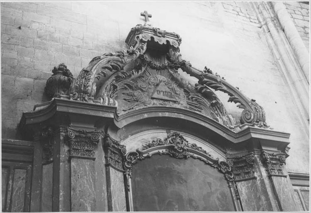 Autel et retable, décor latéral et statues de deux anges adorateurs, marbres veinés (gris et rouge) et pierre sculptée, peinte et dorée. L'autel est adossé à un monumental retable à pilastres composites dont l'entablement porte un fronton où se retrouvent les éléments d'un baldaquin. Un emmarchement de pierre galbé le précède, ceinturé par une grille basse à décor d'arcs brisés. Une marche de bois s'étend devant, limitée à la longueur même de l'autel. L'ensemble, que complètent latéralement un jeu de panneaux, occupe toute la partie inférieure de la paroi est du bras nord du transept. En forme de tombeau, galbé sur toutes ses faces, l'autel dont un forte gorge souligne le rebord de la table, est orné en son centre d'une croix rayonnante de marbre blanc. Il est prolongé latéralement par les dés portant les deux pilastres extérieurs du retable, ils sont dédoublés par deux autres disposés obliquement pour en encadrer la partie centrale dont un bas-relief de marbre blanc (déjà classé) constitue la prédelle. Cette prédelle est surmontée d'un grand tableau à fronton cintré, à bordure rocaille, montrant le Christ au jardin des Oliviers (déjà classé). Précisons que le gradin placé devant la prédelle semble être une adjonction du 19e siècle. La corniche courant au sommet de l'ensemble, cintrée en sa partie centrale, supporte un fronton où des nuées rayonnantes exaltent le triangle de la Trinité. Les volutes d'un baldaquin, en arrière desquelles deux vases laissent échapper des chutes de fleurs mêlées de palmes et de guirlandes, l'encadrent et supportent un couronnement d'où retombe un lambrequin. Latéralement, d'étroits panneaux verticaux concaves disposés obliquement éloignent le retable de la paroi qui, entre celui-ci et les faisceaux de colonnettes supportant les nervures des voûtes est recouverte d'un assemblage de panneaux de marbre. En leur centre, de part et d'autre du retable, une importante console, constituée d'éléments d'une rocaille assagie et de guirlandes, porte un ange adorateur agenouillé ailes déployées. Ces deux anges, de très bonne facture, offrent des attitudes différentes extrèmement gracieuses et animées.