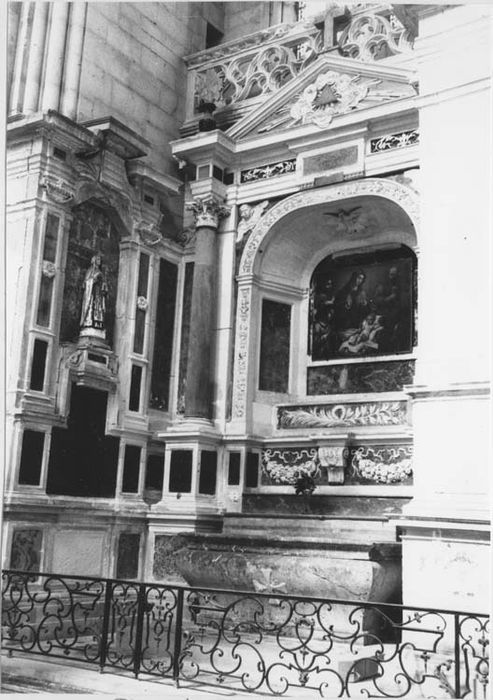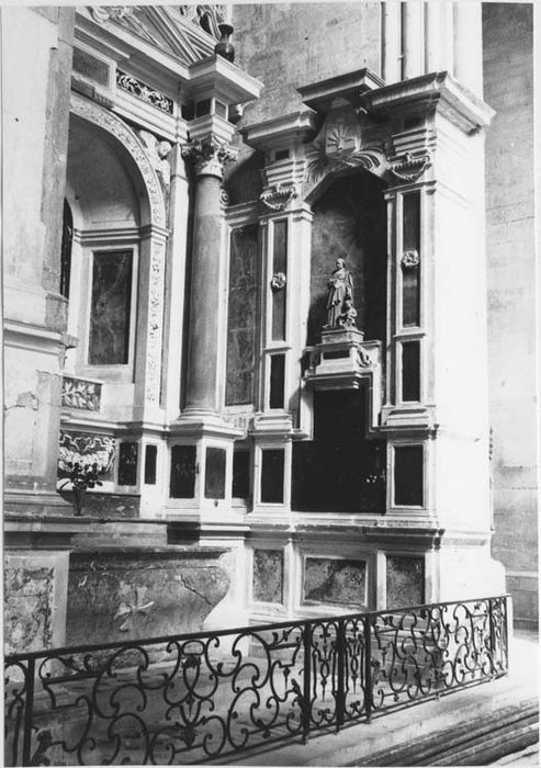 Ensemble de la chapelle Saint-Joseph, grille. Pierre blanche, marbres noirs et de couleurs, plâtre peint, fer forgé. L'autel de marbre rouge veiné de gris en forme de tombeau fortement galbé est inséré dans le décor de pierre blanche et de marbre noir qui en constitue le retable ; décor qui s'étend aux parois de la chapelle qui l'abrite et dont une grille basse limite la surface. Un soubassement assez élevé porte les dés de deux colonnes à chapiteaux corinthiens formant avant-corps et réunies par leur entablement ; le fronton triangulaire qui les surmonte n'est que le fruit d'une mauvaise restauration du siècle dernier. Occupant toute la surface entre ces colonnes, une large niche assez profonde, aux côtés et au plafond établis obliquement, est également entourée d'une large bordure sculpté de fleurs et de fruits. Destinée à la présentation d'un reliquaire (un buste d'argent de saint Joseph réalisé en 1680 et disparu lors de la Révolution), elle est aujourd'hui occupée par un tableau (voir le dossier le concernant). Sa partie inférieure régnant avec les dés des colonnes est remplie de part et d'autre d'une console par deux opulentes guirlandes. Le revêtement de chacune des parois latérales continue celui des parties inférieures du retable et se pare de deux pilastres doriques moins élevés que les colonnes, ayant leur propre entablement ; ils encadrent une sorte de niche sans profondeur dont le sommet se clôt en trapèze. L'une de ces niches aurait abrité le buste de Philippe Legras, Major de Toul, aux dépens duquel fut élevé cet ensemble. Une inscription restituée en 1886 en rapelle la mémoire, de même que ses armes également restituées sur l'entablement de gauche. Grille : la grille est composée par rapport à son axe de deux éléments longs disposés chacun entre deux étroits panneaux verticaux. Deux de ces panneaux se trouvent donc accolés au centre, constituant une porte de peu de largeur. Un jeu de volutes contrariées rehaussées de quelques discrets motifs végétaux et de fleurons, anime avec élégance les éléments longs, en une composition qui témoigne de l'habileté des ferronniers du milieu 18e siècle. Les panneaux verticaux sont d'un dessin moins heureux.