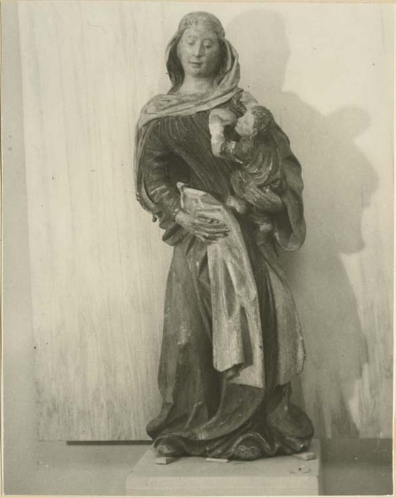 La tête a été retaillée pour recevoir une couronne métallique. Le bras gauche de l'Enfant est réparé au plâtre.