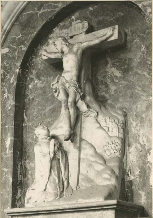 POP | Plateforme ouverte du patrimoinegroupe sculpté : un Chanoine agenouillé aux pieds du Christ en croix