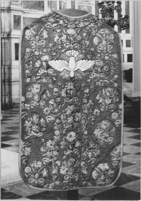 matériau textile : damas, brodé ; soie : brodé ; verre