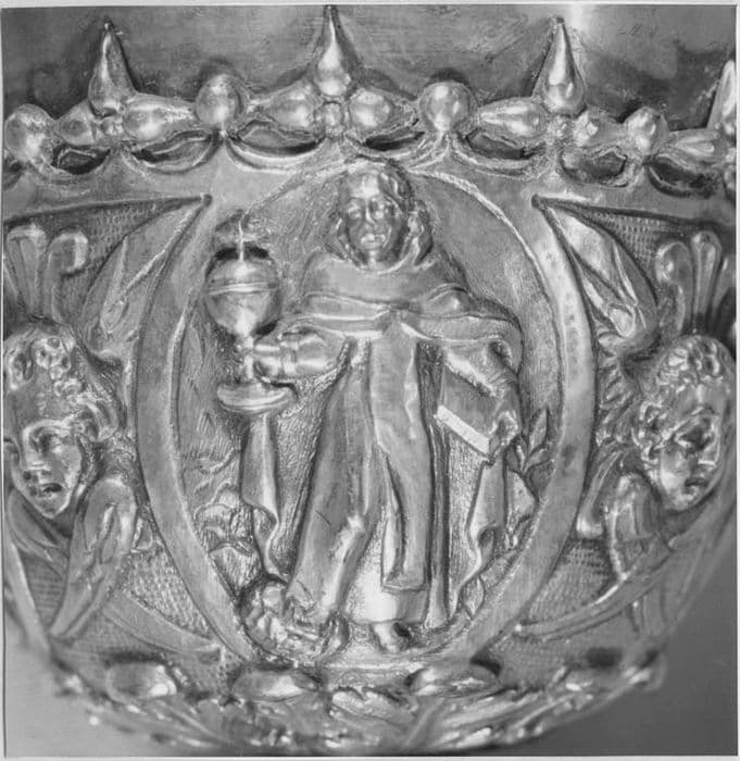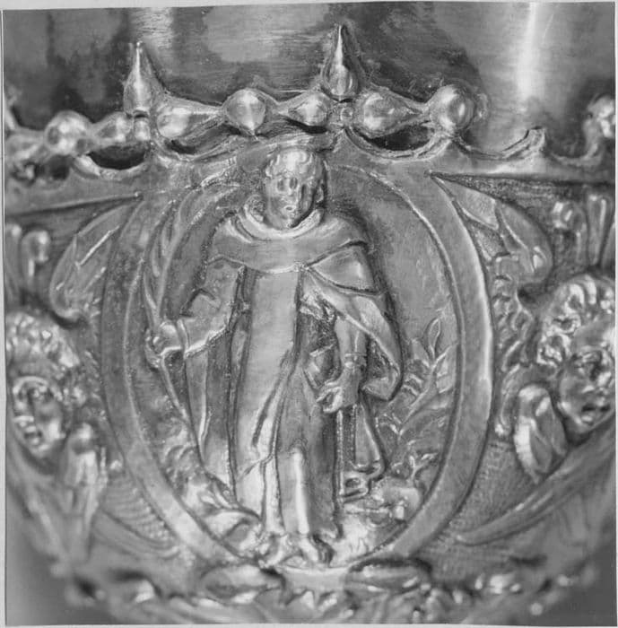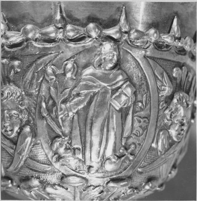 Un rang de feuilles d'acanthe profilées selon une doucine, ajourées entre elles, repose par l'extrémité de ses feuilles sur un cercle formant l'assise du pied. Au-dessus d'une ceinture d'ove quatre bas-reliefs, que séparent de minces volutes naissant de fleurons renversés, en couvrent la partie supérieure, fortement bombée, et se relevant pour former la base de la tige décorée de courtes volutes, dont le départ réél est accusé par un tore godronné ; quatre feuilles d'acanthe, étalées, supportent alors un fort noeud ovoïde où d'autres volutes dessinent trois médaillons ovales occupés par des figures de saintes. Une large gorge, coupée d'un rang de perles, conduit à un second tore godronné, relié par une scotie aux larges feuilles d'acanthe formant le dessous de la fausse coupe, dont la surface est occupée entre quatre têtes d'angelots ailées, en demi-relief, par quatre médaillons ovales offrant autant de figures de saints. Un feston où alternent avec des perles sphériques, d'autres perles piriformes disposées en tréfles, en cerne l'ouverture où s'enchasse la coupe, nue et de forme tronconique. Iconographie : sur le pied, la Crucifixion, la Nativité, la Cène et la Descente du Saint-Esprit ; sur le noeud, la Madeleine, sainte Catherine-de-Sienne, une sainte Dominicaine ; sur la fausse coupe, saint Dominique, saint Pierre-de-Vérone, saint Hyacinthe et un saint Dominicain. Technique : le pied et la coupe sont réunis par deux larges pas de vis. Le décor est fondu et les fonds obtenus à l'outil. Le pied est recouvert d'une mince feuille d'argent maintenue par des rivets. Le feston de la fausse coupe semble avoir été estampé, puis soudé. Patène : la face est sans décor. Au centre du revers, un bas-relief figure l'Assomption de la Vierge. Des têtes d'angelots occupent toute la partie supérieure. Sur la bordure, une couronne d'épines gravée entrelace ses rameaux entourant instruments, symboles et attributs de la Passion. Technique : feuille d'argent sur laquelle a été soudé le bas-relief au revers, lui-même obtenu par la fonte.