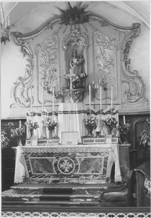 Panneau de boiserie servant de retable (fonctions combinées). Bois repeint et doré. Ce vaste panneau par sa forme et l'exhubérance de son décor, surprenant et monumental témoignage de l'art de la rocaille, couvre le mur du fond du sanctuaire au-dessus d'une boiserie à laquelle il n'est pas lié par son échelle, tout en l'étant par son style. Il a pour centre une niche abritant une médiocre statue de la Vierge portée sur une large console. De part et d'autre, deux hauts panneaux sont remplis par des chutes d'objets du culte mêlées de palmes, d'épis et de pampres. Les flanquent deux puissants ailerons aux amples volutes liées à leur partie supérieure par des agrafes de feuillages à une corniche chantournée, entièrement sculptée en sa gorge, et coupée à son sommet d'une masse de nuages rayonnants d'où sortent des têtes d'angelots ailées.