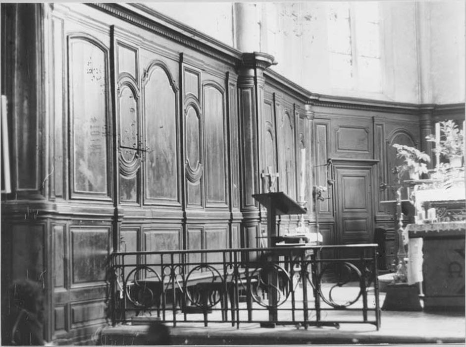 Boiseries du choeur. Elles sont constituées de panneaux verticaux plus ou moins larges, séparés par des moulures en relief. Elles habillent les murs plats entre les piliers, mais aussi les piliers demi-ronds du choeur. A droite et à gauche du maître-autel, ils dessinent la forme de deux portes non ouvrantes. Elles sont par contre découpées pour les accès au clocher (à gauche) et à la sacristie (à droite). Le sommet est arrêté par une corniche. Elles sont peintes en brun, avec filets dorés sur les moulures (quelques ouvertures ont été pratiquées pour l'installation électrique).