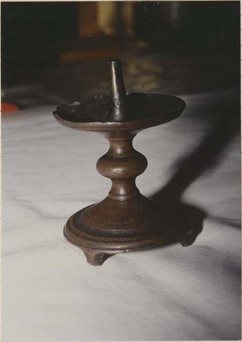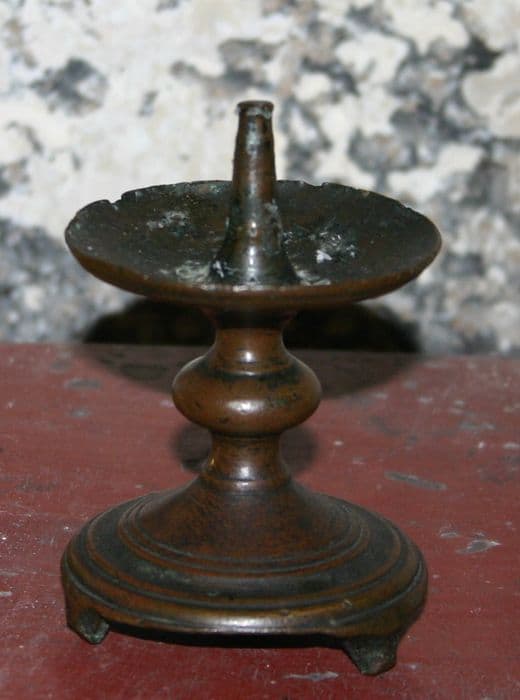 Petit chandelier. Il présente une pointe dans une coupe creusée ; sous un noeud, la base rainurée repose sur trois petits pieds.