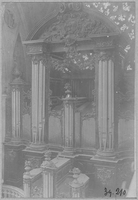 Ce buffet d'orgue se compose d'un avant-corps assez bas à trois rangées de tuyaux verticaux et d'un corps principal assez haut. Deux supports, où sont adossés les plus gros tuyaux soutiennent un grand fronton rond avec en haut un socle et une statue. Un écusson dans le fronton, entouré de rinceaux, frise décorée et unie au milieu, guirlandes pendantes de roses. En bas, motifs Louis XV et en avant, trois fûts et trois vases remplis de fleurs.