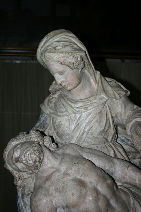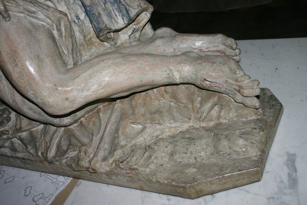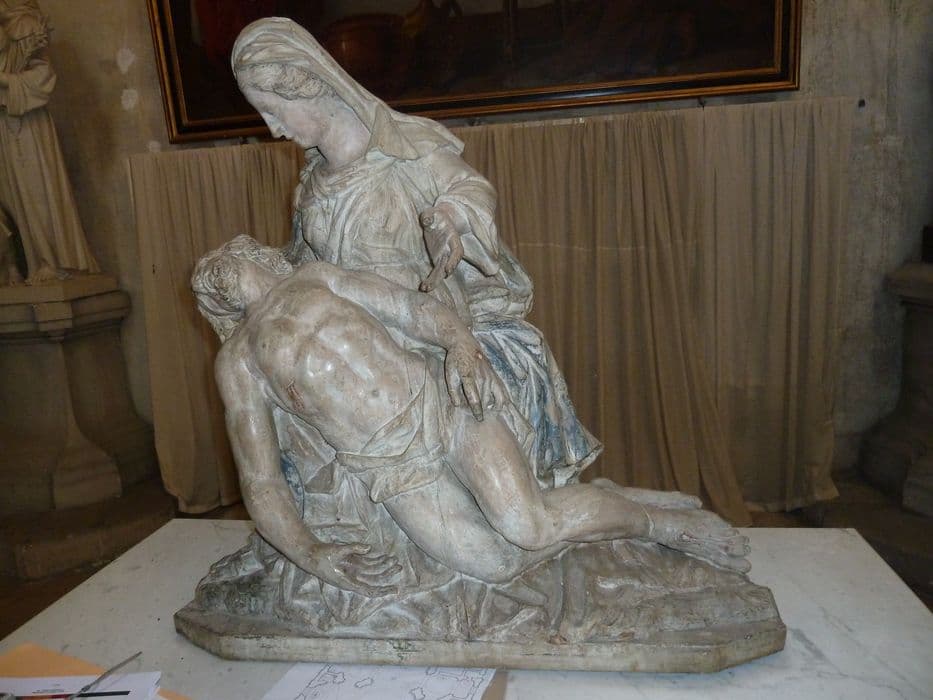 Vierge de piété, groupe en bois dont la polychromie est lacunaire.