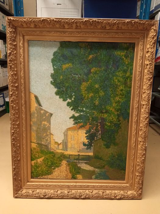 tableau et cadre : La Pexure : ruisseau dans un village, sous un grand arbre