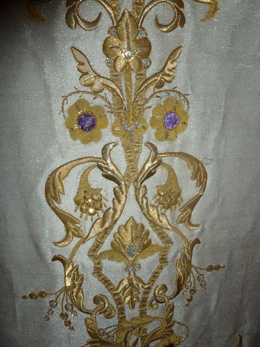 Toile d'argent, broderies d'or et d'argent, améthystes.
